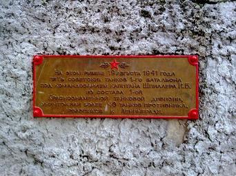 | Keywords: Памятная доска на постаменте памятника.jpg ru Памятная доска на постаменте памятника а этом убеже 19 августа 1941 года пять советских танков 1-го батальона под командованием капитана Шпилле а И Б из состава 1-ой К аснознаменной танковой дивизии уничтожили более 40 танков п отивника вавшихся к Ленинг аду own Uchkhoz1 2011-08-01 Cc-zero Novyy Uchkhoz Zinoviy Kolobanov Plaques in Leningrad Oblast Plaques in Russian Plaques referencing 1941 Military plaques | ||||