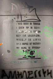 | Keywords: writing text I WAS BORN IN TUNISIA I GREW UP IN EGYPT I FOUGHT IN YEMEN NOW I'M SACRIFICING MYSELF IN LIBYA WITH HOPES OF VICTORY MY NAME IS FREEDOM Athens, Greece (2012) By Sarah Skiold-Hanlin I WAS BORN IN TUNISIA I GREW UP IN EGYPT I FOUGHT IN YEMEN NOW I'M SACRIFICING MYSELF IN LIBYA WITH HOPES OF VICTORY MY NAME IS FREEDOM Athens, Greece (2012) By Sarah Skiold-Hanlin |