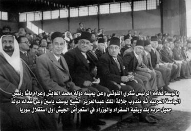 | Keywords: الاحتفال بعيد الجيش الأول في سورية يوم 1 آب 1945.jpg ar الخامس من اليمين مستشار رئيس الجمهورية الامير عادل ارسلان - وزير العدل سعيد الغزي - وزير الخارجية ورئيس الوزارة بالوكالة جميل مردم بك - فخامة رئيس الجمهورية شكري القوتلي - رئيس مجلس النواب بالوكالة محمد العايش - أمين عام جامعة الدول العربية عبد الرحمن عزام الشيخ يوسف ياسين ممثل الملك عبد العزيز آل سعود 2013-12-19 00 40 54 www syrianhistory com موقع التاريخ السوري cc-by-sa-3 0 PD-Syria Mohammed Alayiesh Government ministers of Syria 1945 in Syria |