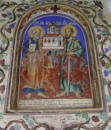 | Keywords: Св.Петар и Павле влезна Тресонче.jpg en Fresco in Sts Peter and Paul Church Tresonče Macedonia П авославен х ам Свети Апостоли Пета и Павле село Т есонче во издание на узеј на Г ад Скопје јуни-јули 1995 Author 1844 PD-Macedonia Sts Peter and Paul Church Tresonče Frescos in the Republic of Macedonia Dicho Zograf |