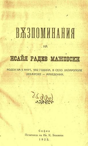 | Keywords: Спомените на Исаија Мажовски.jpg cite book Вѫзпоминания ажовски Исайя Радевъ 1922 Печатница на Ив К Божиновъ София mk асловната ст ана на Спомените на Исаија ажовски издадени 1922 год во Софија http //macedonia-history blogspot com/2006/11/isaja-radev-mazovski-mazovski-isaja html Isaija Mažovski 1852 1926 1922 PD-art Isaija Mažovski |