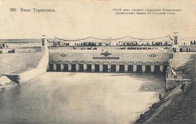 | Keywords: Головное сооружение Романовского канала.jpg en General view of a head construction of the irrigating Romanovsky channel in Hungry steppe ru Общий вид головного соо ужения о осительного Романовского канала в Голодной степи de Wehrkonstruktion des Bewässerungssystems Romanow-Kanal in der Hungersteppe Turkestan heute vermutlich Usbekistan evtl Kasachstan Post card author < 1913 PD-old Dams in Uzbekistan | ||||