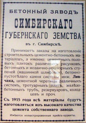 | Keywords: Бетонный-завод.jpg  ru Реклама бетонных изделий завода Симби ского земства Advertizing of Simbirsk municipal concrete works mentioning in bold face Fyodor Livchak's technology own unknwon 1915 PD-old Ulyanovsk Fyodor Livchak 1915 in Simbirsk Governorate 1915 advertisements Advertisements in Russia |