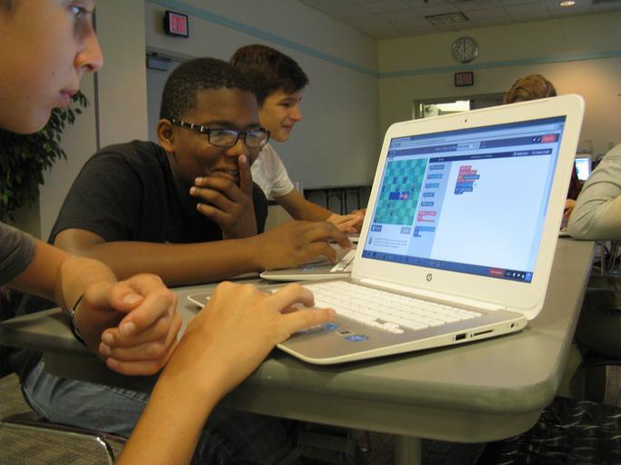 Keywords: kalamazoo kalamazoo public library kalamazoopubliclibrary code indoor KPL Code Camp: Teens work together to solve problems while learning basic computer programming skills, www.kpl.gov KPL Code Camp: Teens work together to solve problems while learning basic computer programming skills, www.kpl.gov