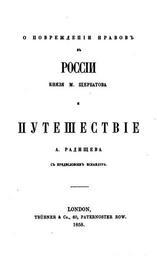 | Keywords: Щербатов и Радищев в издании Герцена.jpg en On the Corruption of Morals in Russia Mikhail Shcherbatov Journey from St Petersburg to Moscow Alexander Radishchev Title page Free Russian Press London 1855 ru О пов еждении н авов в России князя Ще батова и Путешествие из Санкт-Пете бу га в оскву А Радищева Титульный лист Издание Вольной усской типог афии 1858 год Сделал сам А И Ге цен П Ога ёв 1858 Alexander Radishchev Title pages from Russia Free Russian Press House of Tcherbatov 1858 books Published in London Books from the United Kingdom in Russian PD-old |