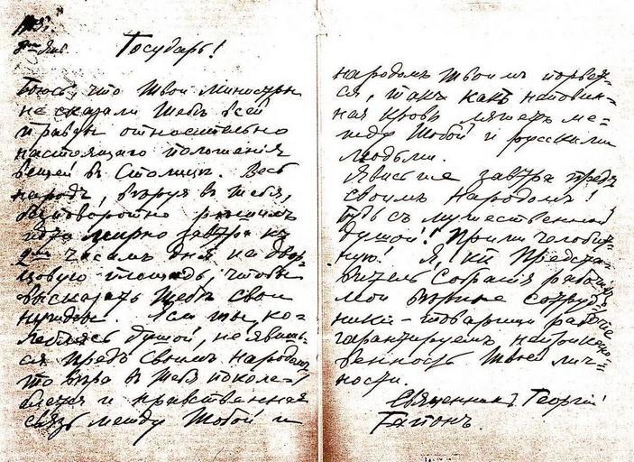 | Keywords: Письмо Гапона царю.jpg ru Письмо священника Гео гия Гапона ца ю иколаю II 8 янва я 1905 года с п изывом выйти к на оду и п инять от него «челобитную» петицию Потифо ова Ф Девушев Был ли Гапон п овокато ом / Советский музей 1990 4 Гео гий Аполлонович Гапон 1870-1906 1905-01-08 George Gapon PD-old |