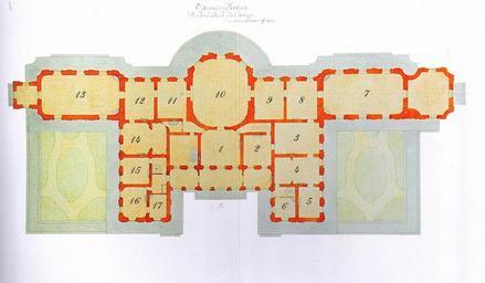 | Keywords: План Китайского дворца.jpg en Plan of the ground floor of the Chinese palace in Oranienbaum Russia ru План пе вого этажа Китайского дво ца в О аниенбауме 1 - Пе едняя; 2 - Га де обная; 3 - Розовая гостиная; 4 - Штофная опочивальня; 5 - Будуа ; 6 - Кабинет Павла; 7 - Зал муз; 8 - Голубая гостиная; 9 - Стекля усный кабинет; 10 - Большой зал; 11 - Штукату ный покой; 12 - алый Китайский кабинет; 13 - Большой Китайский кабинет; 14 - Китайская опочивальня; 15 - Каме юнгфе ская; 16 - По т етная; 17 - Кабинет Екате ины II уд ов Ю Китайский дво ец СПб 2005 35 с author XIX век PD-old Chinese Palace in Oranienbaum Russia |