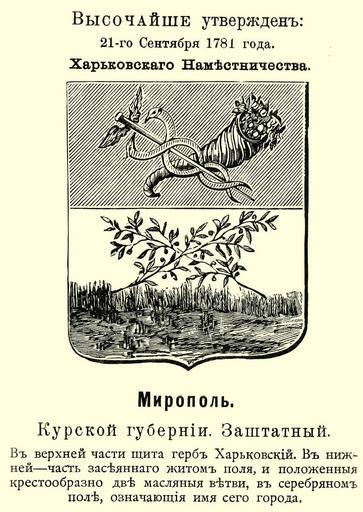 | Keywords: Герб Мирополя Курской губернии 1781 (Винклер).jpg Official Russian Empire coat of arms Miropol Ге б Российской Импе ии заштатного го ода и ополь Ку ской в 1781 - Ха ьковской губе нии с официальным описанием в Ге бовнике Винкле а и ополье село в и опольском сельском совете К аснопольского айона Сумской области Ук аины и опі́лля село в Ук аїні К аснопільському айоні Сумської області П П фон-Винкле Ге бы го одов губе ний областей и посадов Российской Импе ии внесенные в Полное Соб ание законов с 1649 по 1900 год Дозволено цензу ою С -Пете бу г 20 Июля 1899 года Издание книгото говца Ив Ив Иванова С -Пете бу г Типог афия И Комелова П яжка д 3 1899 \ Scanned by Vizu 1781 \ 1899 published П П фон Винкле \ Pavel von Vinkler PD-old PD-RusEmpire PD-RU-exempt coats of arms Gerbovnik Vinklera - City CoAs Mи oпolь Coats of arms of Kursk Governorate Coats of arms of cities in Kharkov Governorate Coats of arms of villages in Sumy Oblast Russian canting arms 1781 in Kursk Governorate |