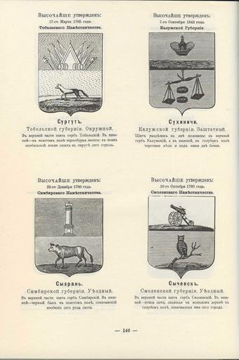 | Keywords: Сургут Сухиничи Сызрань Сычевск из Винклера.jpg Official Russian Empire coats of arms Ге бы го одов Российской Импе ии Су гут Сухиничи Сыз ань Сычевск - с официальным описанием в Ге бовнике Винкле а П П фон-Винкле Ге бы го одов губе ний областей и посадов Российской Импе ии внесенные в Полное Соб ание законов с 1649 по 1900 год Дозволено цензу ою С -Пете бу г 20 Июля 1899 года Издание книгото говца Ив Ив Иванова С -Пете бу г Типог афия И Комелова П яжка д 3 1899 \ Scanned by Vizu 1899 published П П фон Винкле \ Pavel von Vinkler PD-old PD-RusEmpire PD-RU-exempt coats of arms Gerbovnik Vinklera - Pages 146 Coats of arms of Tobolsk Governorate Surgut |