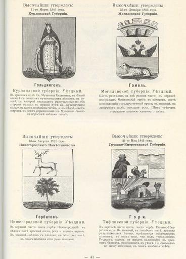 | Keywords: Гольдинген Гомель Горбатов Гори из Винклера.jpg  Official Russian Empire coats of arms Ге бы го одов Российской Импе ии Гольдинген Гомель Го батов Го и с официальными описаниями в Ге бовнике Винкле а П П фон-Винкле Ге бы го одов губе ний областей и посадов Российской Импе ии внесенные в Полное Соб ание законов с 1649 по 1900 год Дозволено цензу ою С -Пете бу г 20 Июля 1899 года Издание книгото говца Ив Ив Иванова С -Пете бу г Типог афия И  Комелова П яжка д 3 1899 \ Scanned paper book 1899 published П П фон Винкле \ Pavel von Vinkler PD-old PD-RusEmpire PD-RU-exempt coats of arms Gerbovnik Vinklera - Pages 041 Coats of arms of Kurlandia Governorate Coats of arms of Mahilioŭ Governorate Coats of arms of Novgorod Governorate Coats of arms of Tiflis Governorate |