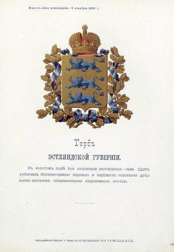 Keywords: Эстляндская губерния из Бенке.jpg Official Russian Empire coat of arms Estlandia Governorate Ге б Российской Импе ии Эстляндской губе нии с официальным описанием в Ге бовнике Бенке Утве ждён Импе ато ом Все оссийским Александ ом Вто ым Ге бы губе ний и областей Российской Импе ии Отпечатано по аспо яжению минист а внут енних дел Санкт-Пете бу г Ка тог афическое заведение А А Ильина и типог афия инисте ства путей сообщения А Бенке 1880 / Scanned on paper album 1856 / 1880 published Russian Empire PD-old PD-RusEmpire PD-RU-exempt coats of arms <gallery> File Эстляндская губ ВД Бенке jpg File Эстляндская губе ния изд Сукачова A JPG File Эстляндская губе ния изд Сукачова JPG File Coat of Arms of Estland gubernia Russian empire png </gallery> <references/> Coats of arms of Estlandia Governorate 3 lions passant in heraldry Gerbovnik Benke Crowns in crest Coats of arms of Estonia Oak wreaths in supporters Azure gules Or in heraldry |