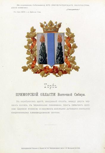 | Keywords: Приморская область из Бенке.jpg Official Russian Empire coat of arms Primorsk Oblast Ге б Российской Импе ии П имо ской области с официальным описанием в Ге бовнике Бенке Утве ждён Импе ато ом Все оссийским Александ ом Вто ым в 1878 году Ге бы губе ний и областей Российской Импе ии Отпечатано по аспо яжению минист а внут енних дел Санкт-Пете бу г Ка тог афическое заведение А А Ильина и типог афия инисте ства путей сообщения А Бенке 1880 / Scanned on paper album 1878 / 1880 published Russian Empire PD-old PD-RusEmpire PD-RU-exempt coats of arms <gallery> File П имо ская область ВД Бенке jpg File П имо ская область изд Сукачова JPG File Хаба овск 1878 из Винкле а jpg File Coat of Arms of Primorye oblast Russian empire png </gallery> <references/> Coats of arms of Primorsk Oblast Gerbovnik Benke |