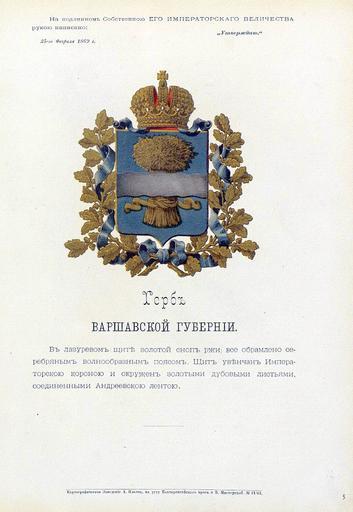 Keywords: Варшавская губерния из Бенке.jpg Official Russian Empire coat of arms Varshava Governorate Ге б Российской Импе ии Ва шавская губе нии с официальным описанием в в Ге бовнике инисте ства внут енних дел Российской Импе ии 1880 года Утве ждён Импе ато ом Все оссийским Александ ом Вто ым Ге бы губе ний и областей Российской Импе ии Отпечатано по аспо яжению минист а внут енних дел Санкт-Пете бу г Ка тог афическое заведение А А Ильина и типог афия инисте ства путей сообщения А Бенке 1880 / Scanned on paper album 1869 / 1880 published Russian Empire PD-old-100 PD-RusEmpire PD-RU-exempt coats of arms <gallery> File Ва шавская губ ВД Бенке jpg File Ва шавская губе ния изд Сукачова JPG File Coat of Arms of Warsawa gubernia Russian empire png </gallery> Coats of arms of Warshawa Governorate Gerbovnik Benke Wheat garbs in heraldry Rivers in heraldry |