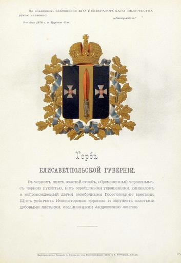 Keywords: Елисаветпольская губерния из Бенке.jpg Official Russian Empire coat of arms Elisavetpol Gubernia Ге б Российской Импе ии Елисаветпольской губе нии с официальным описанием в Ге бовнике Бенке Утве ждён Импе ато ом Все оссийским Александ ом Вто ым Ге бы губе ний и областей Российской Импе ии Отпечатано по аспо яжению минист а внут енних дел Санкт-Пете бу г Ка тог афическое заведение А А Ильина и типог афия инисте ства путей сообщения А Бенке 1880 / Scanned on paper album 1878 / 1880 published Russian Empire PD-old-100 PD-RusEmpire PD-RU-exempt coats of arms <gallery> File Елисаветпольская губ ВД Бенке jpg File Елизаветпольская губе ния изд Сукачова jpg File Coat of Arms of Yelizavetpol Governorate png </gallery> <references/> Coats of arms of Elisabethpol Governorate Gerbovnik Benke Pilum in art Swords in heraldry Crosses in heraldry |