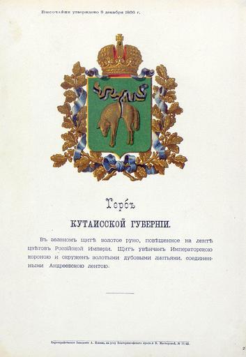 | Keywords: Кутаисская губерния из Бенке.jpg  Official Russian Empire coat of arms Kutais Governorate Ге б Российской Импе ии Кутаисской губе нии с официальным описанием в Ге бовнике  инисте ства внут енних дел Российской Импе ии Утве ждён Импе ато ом Все оссийским Александ ом Вто ым <br /> Ге бъ КУТАИССКОЙ ГУВЕР IИ<br /> ВЫСОЧАЙШЕ утве ждено 8 декаб я 1856 г <br /> Въ зеленомъ щите золотое  уно повешенное на ленте цветовъ Россійской Импе іи Щитъ увенчанъ Импе ато скою ко оною и ок уженъ золотыми дубовыми листьями соединенными Анд еевскою лентою Ге бы губе ний и областей Российской Импе ии Отпечатано по  аспо яжению минист а внут енних дел Санкт-Пете бу г Ка тог афическое заведение А А Ильина и типог афия  инисте ства путей сообщения А Бенке 1880 / Scanned on paper album 1856 / 1880 published Russian Empire PD-old-100 PD-RusEmpire PD-RU-exempt coats of arms <gallery> File Кутаисская губ  ВД Бенке jpg File Кутаисская губе ния изд Сукачова JPG File Coat of Arms of Kutais Governorate png </gallery> Coats of arms of Kutaisi Governorate Gerbovnik Benke Golden fleece in heraldry |