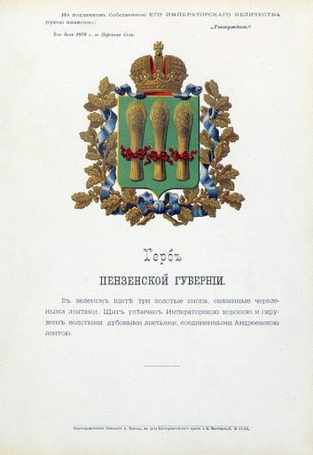 | Keywords: Пензенская губерния из Бенке.jpg  Official Russian Empire coat of arms Penza Governorate Ге б Российской Импе ии Пензенской губе нии с официальным описанием в Ге бовнике Бенке Утве ждён Импе ато ом Все оссийским Александ ом Вто ым в 1878 году Ге бы губе ний и областей Российской Импе ии Отпечатано по  аспо яжению минист а внут енних дел Санкт-Пете бу г Ка тог афическое заведение А А Ильина и типог афия  инисте ства путей сообщения А Бенке 1880 / Scanned on paper album 1878 / 1880 published Russian Empire PD-old PD-RusEmpire PD-RU-exempt coats of arms <gallery> File Пензенская губ  ВД Бенке jpg File Пензенская губе ния изд Сукачова jpg File Coat of Arms of Penza gubernia Russian empire png </gallery> <references/> Coats of arms of Penza Governorate Gerbovnik Benke Wheat garbs in heraldry |