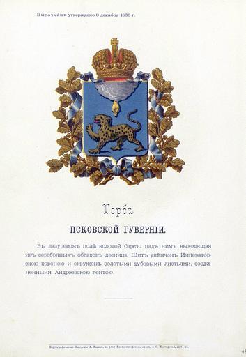 | Keywords: Псковская губерния из Бенке.jpg Official Russian Empire coat of arms Pskov Governorate Ге б Российской Импе ии Псковской губе нии с официальным описанием в Ге бовнике Бенке Утве ждён Импе ато ом Все оссийским Александ ом Вто ым Ге бы губе ний и областей Российской Импе ии Отпечатано по аспо яжению минист а внут енних дел Санкт-Пете бу г Ка тог афическое заведение А А Ильина и типог афия инисте ства путей сообщения А Бенке 1880 / Scanned on paper album 1856 / 1880 published Russian Empire PD-old-100 PD-RusEmpire PD-RU-exempt coats of arms <gallery> File Псковская губ ВД Бенке jpg File Псковская губе ния изд Сукачова jpg File Coat of Arms of Pskov gubernia Russian empire png </gallery> Coats of arms of Pskov Governorate Gerbovnik Benke Panthera pardus in heraldry Hands in heraldry |