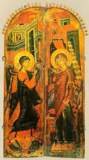 | Keywords: Благовештение-Ботун.JPG mk Композицијата Благовештение од XV век Димензии 119 x 62 cm Темпе а Гипсен г унд на штица Од ц квата Св Бого одица во с Ботун Ох идско Денес во гале ијата на икони Ох ид http //www soros org mk/konkurs/019/i50golema htm author century 15 PD-old-100 PD-old-100 FAL Icons of the Republic of Macedonia Church of the Theotokos Botun Icons of Annunciation with yarn Ohrid Icon Gallery | ||||
