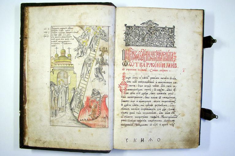 | Keywords: Лествица Иоанна Синайского.jpg  ru Лествица Иоанна Синайского XVIII век 222 листа  аписана полууставом заголовки и инициалы выполнены кинова ью 2 миниатю ы Г ави ованная заставка из ста опечатного издания Пе еплёт доски обтянутые кожей с тиснением 2 застёжки П оисходит из  ило-Со ской пустыни Х анится в Ки илло-Белозе ском музее 2000-05-29 http //www kirmuseum ru/info/collection/detail php ID 2267 author PD-Art Uploaded with UploadWizard Museum of Kirillo-Belozersky Monastery Church of St John Climacus Kirillo-Belozersky monastery |