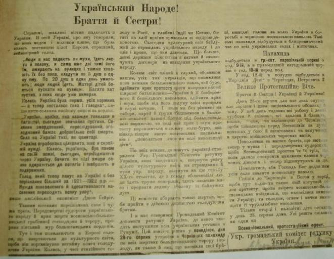 | Keywords: Український Народе! Браття й Сестри!.jpg  uk  ате іали д укованої п еси науково-довідкової бібліотеки де жавного а хіву Че нівецької області які висвітлюють події Голодомо у на Ук аїні 1932  1933  оків Газета  а одна сила 20 се пня 1933   58 с 1 Author 1933 Holodomor Newspapers of Ukraine 1933 Funds of state archive of Chernivtsi Oblast PD-old  |