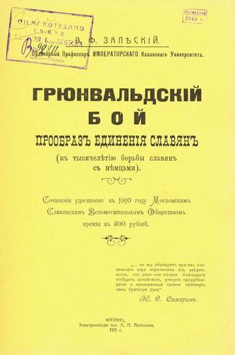 Keywords: Обложка книги В.Ф.Залеского =Грюнвальдский бой...=.jpg ru Обложка книги Залеский В Ф Г юнвальдский бой - п ооб аз единения славян к тысячелетию бо ьбы славян с немцами - Казань Элект ическая типог афия Л П Антонова 1911 Обложка книги Скани овано И Е Алексеевым 17 декаб я 2005 г Книга издана в 1911 г PD-old Title pages from Russia Books from Russia 1911