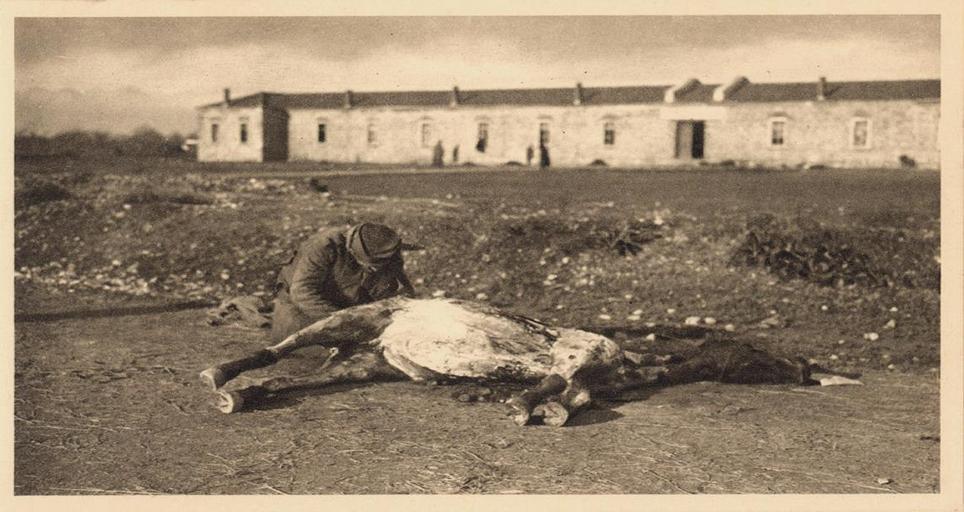 | Keywords: Српски војник скида месо са угинулог коња.JPG  sr С пски војник скида месо са угинулог коња фотог афија Самсона Че нова објављена у албуму Петогодишњи  ат  С би 1912-1916 у Лондону 1916 године The image is taken from http //www srpskilist net/istorijski-osvrt/petogodisnji-rat-srbi-1912-1916 here but originally comes from an album The Five Years War  The Serbs in 1912-1916 published in London in 1916 Tchernoff Sampson 1915 PD-old World War I forces of Serbia 1915 in Serbia Sampson Tchernoff Horse meat |