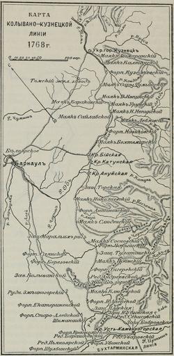 | Keywords: Карта Колывано-Кузнецкой линии 1768 года.jpg Ка та Колывано-Кузнецкой линии 1768 года http //runivers ru/bookreader/book9617/ page/55/mode/1up Колывано-Кузнецкая пог аничная линия // Военная энциклопедия / Под ед В Ф овицкого и д Т 13 - СПб т-во И В Сытина 1913 - С 49 before 1913 author PD-RusEmpire PD-old Russian fortified lines |
