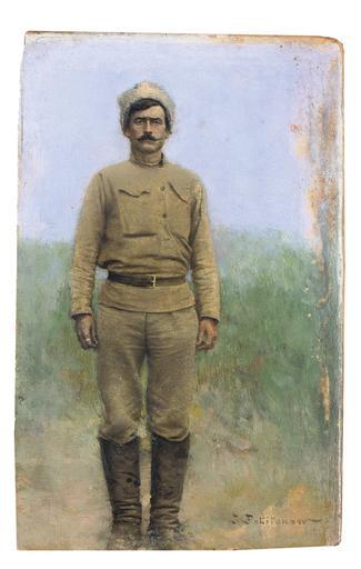 | Keywords: Иван Павлович Похитонов - Мой охранник Иван, Красной гвардии.jpg Artwork Creator Ivan Pokhitonov ой ох анник Иван К асной гва дии Mon gardien le garde-rouge Ivan 1919 oil panel cm 13 3 8 2 object history Provenance Boris Wulfert Pokhitonov ; Gifted by the above's son John Wulfert Pokhitonov to the father of the present owner credit line signed 'I Pokhitonow ' lower right ; with inscription and number ' No 498/'Ivan - le garde rouge'/ à Goratchi Klioutch pres sic Ekaterin/en 1919' on the reverse accession number Christie's online 5146227 PD-old-auto 1923 Ivan Pokhitonov Portrait paintings of men 1919 paintings from Russia |