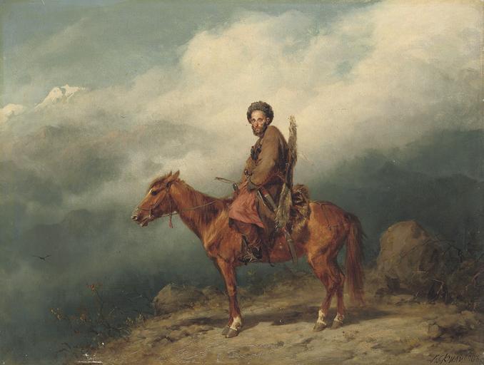 | Keywords: Константин Николаевич Филиппов - Кавказский всадник.jpg Artwork LangSwitch Константин иколаевич Филиппов 1830-1878 Konstantin Nikolayevich Filippov 1830-1878 Кавказский всадник oil canvas cm 39 6 51 7 object history Provenance Possibly the collection of Prince S M Vorontsov numbered 1532 on the stretcher ; Acquired by the grandfather of the present owner circa 1930 credit line signed in Cyrillic 'K Filippov' lower right accession number Christie's online 5146235 PD-Art Konstantin Filippov Paintings of horse riders |