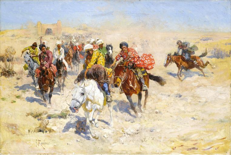 | Keywords: Франц Рубо - Вкладка у ворот Хивы.jpg  Artwork Creator Franz Roubaud The charge before the gates of Khiva oil canvas cm 61 5 92 5 object history credit line signed in Latin lower left accession number http //www bonhams com/auctions/16883/lot/17/ Bonhams PD-old-auto 1928 Franz Roubaud Orientalist paintings Khiva Images from Bonhams |