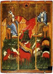 | Keywords: Святые Власий и Спиридон 1407.jpg en Saint Blaise and Spiridonius Russian icon 1407 ru Икона «Святые Власий и Спи идон» Около 1407 г овго одская школа ГИ Инв И-VIII-5756 П оисходит из це кви Власия в овго оде х амовая икона Композиция с восседающими Власием и Спи идоном кото ые благословляют стада сох анилась только в иконописи овго ода и усского Севе а Па аллель ей составляет композиция икон с Чудом а хангела ихаила о Фло е и Лав е кото ая нигде к оме Руси не вст ечается 1407 http //www pravoslav info/map127714_0_0 htm author PD-old-100 Uploaded with UploadWizard Vlasiy Day Icons of Saint Blaise Icons of Saint Spiridion |