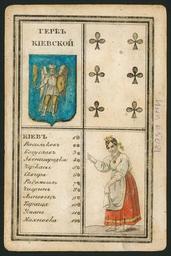 | Keywords: Киевская губерния Игральная карта.png ru Киевская губе ния Иг альная ка та ачало XIX века en This early-19th century playing card is from a set of 60 such cards each devoted to a different province or territory of the Russian Empire which at the time included the Grand Duchy of Finland Congress Poland and Russian America One side of each card shows the local costume and the provincial coat of arms; the other side contains a map This card depicts Kiev Province part of present-day Ukraine Kiev Kyiv in Ukrainian situated on the Dnieper Dnipro in Ukrainian River was the capital of Kievan Rus' in the 10th-12th centuries Kiev was the administrative center of the province and is the capital of present-day Ukraine The card indicates that the distance from Kiev to St Petersburg was 1 249¼ versts and from Kiev to Moscow 876¾ versts A verst is a Russian measurement of distance no longer used equal to 1 0668 kilometers XIX c http //www wdl org/ru/item/4497/ Г ибанов К PD-old-100 Uploaded with UploadWizard Coats of arms of Kiev Governorate Russian National Library collection Images from the World Digital Library |