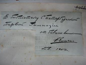 | Keywords: Дарственная надпись Е. Елачича в его книге Происхождение видов и Дарвинизм..jpg  ru Да ственная надпись и автог аф бывшего воспитанника 1-ой Санкт-Пете бу гской гимназии Е Елачича в его книге «П оисхождение видов и Да винизм» пода ок библиотеке гимназии 1904 год 1904 School's Museum collection 321 School St Petersburg The address of museum 191119 Russia Saint-Petersburg Socialisticheskaya St 7 / Pravdy St 11 phone +7 812 764-86-38 e-mail sch321 center-edu/spb/ru Elachich Evgeny Aleksandrovich PD-1923 PD-old-70-1923 Uploaded with UploadWizard The First Saint-Petersburg Gymnasium St Petersburg Russia Signatures of writers from Russia |