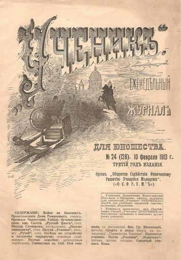| Keywords: Титульный лист журнала Ученик №24 (128), издаваемого В. Яном.jpg ru Ученик Еженедельный жу нал для юношества 24 128 под едакцией В Янчевецкого 10 фев аля 1913 года Т етий год издания 1913 «Ученик» Еженедельный жу нал для юношества 24 128 под едакцией В Янчевецкого 10 фев аля 1913г В Г Янчевецкий PD-1923 PD-old-70-1923 Magazines of Russia 1910 The First Saint-Petersburg Gymnasium St Petersburg Russia Vasily Yan Magazines of Russia to be categorised by name | ||||