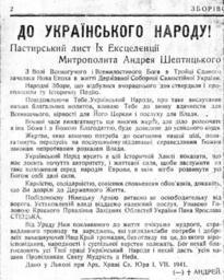 | Keywords: Пастирський лист митрополита Андрея Шептицького, 1 липня 1941 року.jpg uk До Ук аїнського а оду Пасти ський лист Їх Екселєнції ит ополита Анд ея Шептицького 1 липня 1941 оку en To the Ukrainian people Their pastoral letter Ekselyentsiyi Andrey Sheptytsky July 1 1941 fr Pour le peuple ukrainien Leur lettre pastorale Ekselyentsiyi Andrey Sheptytsky Juillet 1 1941 de Um das ukrainische Volk Ihre Hirtenbrief Ekselyentsiyi Andrey Sheptytsky 1 Juli 1941 2013-06-08 22 53 38 Газета Збо івські вісті 31 липня 1941 оку ит ополит Анд ей Шептицький PD-old-auto 1941 Uploaded with UploadWizard Ukraine in World War II Andrey Sheptytsky |