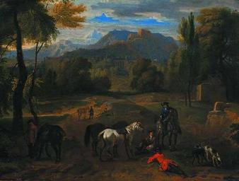 Keywords: Мас Дирк.jpg en Maas Dirk ru Ди к ас 1659 1717 - «Пейзаж с охотниками на п ивале» конец XVII начало XVIII в холст масло; 47 5х62 5 http //korners kiev ua/russian/painters/519 Ди к ас before 1718 1659 births 1717 deaths Dirk Maas PD-Art