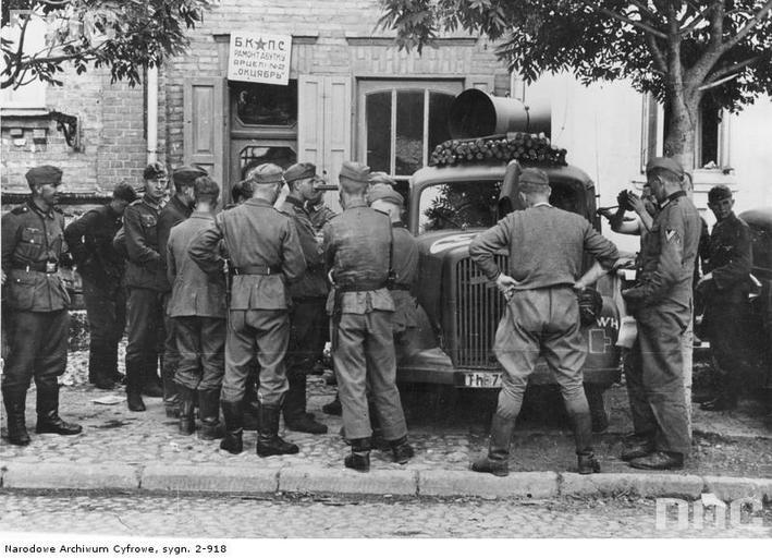 | Keywords: Немцы пад Ружанай — Niemcy pad Ružanaj 03.jpg ямецкія жаўне ы слухаюць навіны з аўтамабільнага гучнагава ыцеля ў ваколіцах w Ружаны be-x-old Żołnierze niemieccy słuchają komunikatów z głośnika samochodowego w okolicy miejscowości Różana 1941-06 http //www audiovis nac gov pl/obraz/2645/d9f52b0531226ad646db78c7f991d76f/ Narodowe Archiwum Cyfrowe Kessler PD-old History of Ružany Pružany rajon in World War II Black and white photographs of military people in uniform Uploaded with UploadWizard |