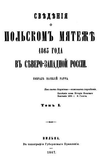 | Keywords: Ратч - Сведения о польском мятеже 1863 г - 1867 AD.jpg en title page of a book В Ратч Сведения о польском мятеже 1863 года в Севе о-Западной России T 1 Wilno city 1867 AD ru обложка книги В Ратч Сведения о польском мятеже 1863 года в Севе о-Западной России T 1 Вильно 1867 г be вокладка кнігі В Ратч Сведения о польском мятеже 1863 года в Севе о-Западной России T 1 Вільня 1867 г reproduction from title page of a book В Ратч Сведения о польском мятеже 1863 года в Севе о-Западной России T 1 Wilno city 1867 AD Vilno governorship office 1867 public domain free Севе о-Западный к ай севе о-западные губе нии Севе о-Западная Русь Паўночна-заходні к ай Паўночна-Заходняя Русь паўночна-заходнія губе ні Kraj Północno-Zachodni Northwestern Krai January Uprising documents Northwestern Krai PD-old |