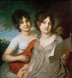 | Keywords: groupshot people Владимир Боровиковский - Портрет сестер княжон Анны Гаврииловны и Варвары Гаврииловны Гагариных Explore irinaraquel's 19728 photos on Flickr! Borovikovsky pt gagarinyh.jpg Artwork Creator Vladimir Borovikovsky Portrait of the Sisters Princess Anna Gavriilovna Gagarina and Princess Varvara Gavriilovna Gagarina The portrait depicts the members of the Russian princely family w Gagarin family Gagarin the daughters of Actual Privy Councilor Gavriil Petrovich Gagarin on the right with a music paper Anna Gavriilovna Gagarina 1782 1856 the married family name Golovina the monastic name Ioanna; on the left with a guitar Varvara Gavriilovna Gagarina 1784 1802 the married family name Elgunova or Sigunova а ка тине изоб ажены доче и действительного статского советника w Гага ин Гав иил Пет ович Гав иила Пет овича Гага ина ru сп ава де жит нотный лист Анна Гав ииловна Гага ина 1782 1856 в замужестве Головина в иночестве Иоанна; слева с гита ой Ва ва а Гав ииловна Гага ина 1784 1802 в замужестве Елгунова или Сигунова 1802 Oil on canvas size cm 69 2 75 Tretyakov Gallery LangSwitch The main building of the gallery 10 Lavrushinsky Pereulok Главное здание гале еи Лав ушинский пе 10 7 cite web V L Borovikovsky Portrait of Princess A G Gagarina and Princess V G Gagarina http //www tretyakovgallery ru/en/collection/_show/image/_id/404 State Tretyakov Gallery 16 May 2012 English <br> cite web В Л Бо овиковский По т ет сестё княжон А Г и В Г Гага иных http //www tretyakovgallery ru/ru/collection/_show/image/_id/404 Госуда ственная Т етьяковская гале ея 16 May 2012 Russian <br> cite book Госуда ственная Т етьяковская гале ея Каталог живописи XVIII начала ХХ века до 1917 года осква Изоб азительное искусство 1984 109 ru object history LangSwitch 1907 purchased by the Council of Tretyakov Gallery from V F Kostareva п иоб етена Советом Т етьяковской гале еи в 1907 г у В Ф Коста евой exhibition history credit line LangSwitch on the balustrade behind the sisters на баллюст аде позади сестё ru Painted by Borovikovsky 1802th Year accession number 109 http //lj rossia org/users/john_petrov/414961 html <gallery>File Les Princesses Anne et Varvara Gagarine jpg Russian Portraits by w Grand Duke Nicholas Mikhailovich of Russia Grand Duke Nicholas Mikhailovich Moscow 1905 1909 онох омная еп одукция из пятитомного издания Русские по т еты XVIII и XIX столетий Издание Великого князя иколая ихайловича «Русские по т еты XVIII и XIX столетий» ru вел кн иколая ихайловича осква 1905 1909 </gallery> LangSwitch See also См также LangSwitch The reproduction of the portrait<br>on the stamp Реп одукция ка тины<br>на почтовой ма ке <gallery> Stamp of Russia 2007 No 1180 Anna and Varvara Gagarin by Borovikovsky jpg LangSwitch The stamp of Russia 15 May 2007 Michel No 1412 Почтовая ма ка России 15 мая 2007 г Каталог ИТЦ « а ка» 1180 </gallery> PD-old-100 Anna and Varvara Gagarin Borovikovskiy 1802 oil on canvas paintings 1800s portrait paintings of Russia female 19th-century oil on canvas paintings in Russia 1800s oil portraits of women at half length Portrait paintings with the balcony Family portraits of Russia Portraits with guitars Portraits of sisters Art works uploaded by Andrew Butko from various sources 1000-1999 px on long side 1802 portrait paintings Originals of images from Russian portraits by Nicholas Mikhailovich Romanov Files uploaded by Andrew Butko from various sources 19th century |