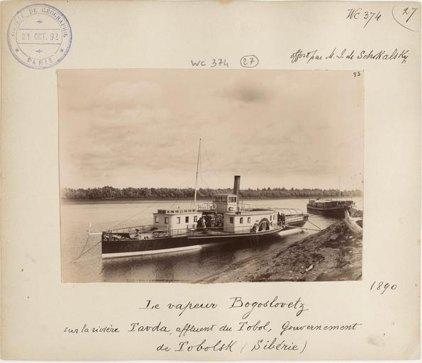 | Keywords: Пароход Богословец.jpg  ru Па оход Богословец на  еке Тавда впадающей в Тобол 1890 Ф анцузское геог афическое общество Шокальский Юлий  ихайлович Custom license marker 2014 05 28 PD-old Uploaded with UploadWizard Yuly Mikhailovich Shokalsky Steamships of Russia Sidewheel riverboats 1890 photographs Tavda River |