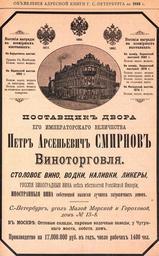 | Keywords: Реклама виноторговли П. А. Смирнова, 1893.jpg ru Реклама виното говли П А Сми нова 1893 год 2014-12-19 00 10 34 авто часть ссылка часть заглавие Ад есная книга го ода С -Пете бу га на 1893 год о игинал ссылка викитека ответственный Ред П О Яблонский издание место СПб издательство Лештуковская па овая ско опечатня П О Яблонского год 1893 том ст аницы столбцы ст аниц се ия ти аж author other versions PD-old-70-1923 Uploaded with UploadWizard Advertising in Russia Pyotr Arsenievich Smirnov |