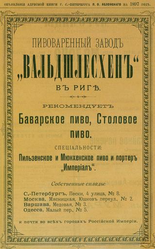 | Keywords: Реклама пивоваренного завода Вальдшлесхен, 1897.jpg  ru Реклама пивова енного завода Вальдшлесхен 1897 год en Advertising brewery Waldschlösschen 1897 2014-12-19 20 40 32 авто часть ссылка часть заглавие Ад есная книга го ода С -Пете бу га на 1897 год о игинал ссылка викитека ответственный Ред П О Яблонский издание место СПб издательство Лештуковская па овая ско опечатня П О Яблонского год 1897 том ст аницы столбцы ст аниц се ия ти аж author other versions PD-old-70-1923 Uploaded with UploadWizard Advertising in Russia Beer |