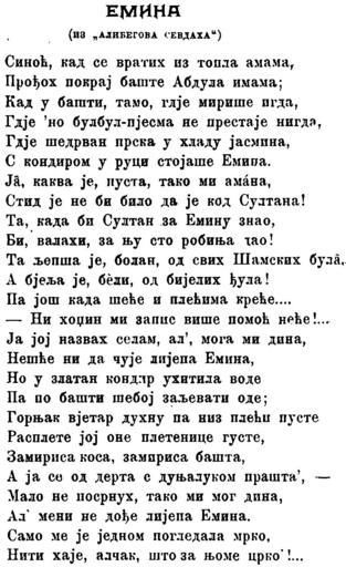 | Keywords: Емина, Алекса Шантић.jpg en The first publication of Aleksa Šantić's popular poem Emina in the Serbian literary journal Kolo sr П во објављивање попула не пјесме Емина Алексе Шантића у с пском књижевном часопису Коло https //archive org/stream/kolo00ivgoog page/n145/mode/2up Aleksa Šantić 1868 1924 1902 PD-Art PD-old-70 Aleksa Šantić Serbian literature |