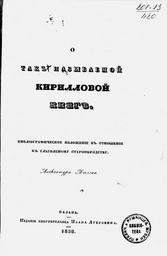 | Keywords: О так называемой Кирилловой книге.jpg ru Титульный лист сочинения Лилова О так называемой Ки илловой книге Библиог афическое изложение в отношении к глаголемому ста ооб ядчеству 2015-06-13 http //dlib rsl ru/viewer/01003581037 page 1 - other versions PD-old-70-1923 Uploaded with UploadWizard Books from Russia 1858 |
