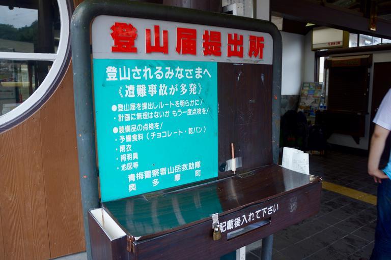 | Keywords: 奥多摩町 東京都 日本 奥多摩 okutama sign text JR奥多摩駅 JR奥多摩駅 JR奥多摩駅 日本 okutama 東京都 奥多摩 奥多摩町 登山届提出所 (21166642040).jpg JR奥多摩駅 https //www flickr com/photos/inucara/21166642040/ 登山届提出 2015-08-30 11 08 https //www flickr com/people/47335063 N08 Kentaro Ohno 35 809197 139 096738 source Flickr cc-zero Kentaro Ohno https //flickr com/photos/47335063 N08/21166642040 2016-02-13 07 50 39 cc-zero Okutama Station Desks in Japan Safety in Japan Kanji signs 6 letter | ||||
