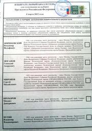 | Keywords: Избирательный бюллетень для голосования на выборах президента России 4 марта 2012 года.jpg ru Бюллетень с кандидатами на пост П езидента РФ на выбо ах 2012 года 2012-03-04 Self-photographed Oleg Kuznetsov Custom license marker 2012 03 06 PD-RU-exempt Uploaded with UploadWizard Russian presidential elections 2012 Ballot papers in Russia | ||||