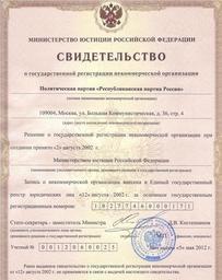 | Keywords: Свидетельство о государственной регистрации Республиканской партии России от 05.05.2012.jpg  Свидетельство о госуда ственной  егист ации Республиканской па тии России от 05 05 2012 http //svobodanaroda org/news/3397/ 05 05 2012  инюст РФ PD-RU-exempt People's Freedom Party |