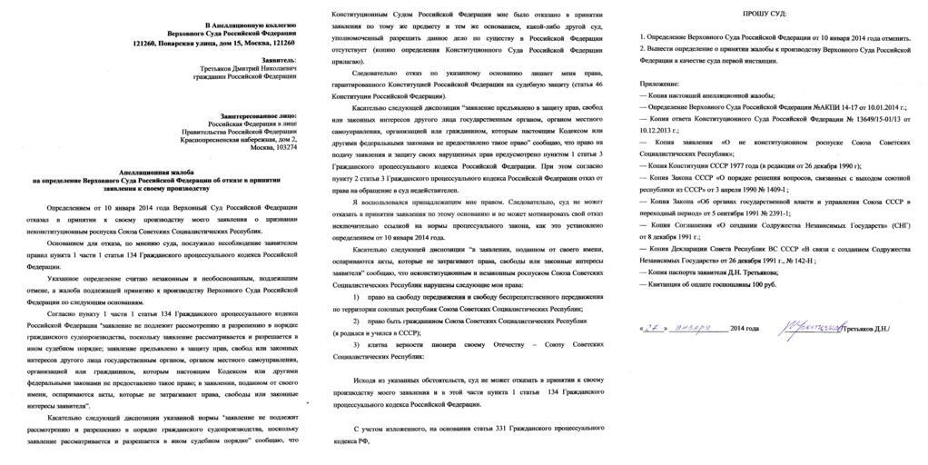 | Keywords: АПЕЛЛЯЦИОННАЯ ЖАЛОБА В КОЛЛЕГИЮ ВЕРХОВНОГО СУДА РФ ПО ДЕЛУ СССР.png ru Апелляционная жалоба в коллегию Ве ховного Суда РФ на Оп еделение об отказе в п инятии к судебному п оизводству об ащения заявления О п изнании оспуска СССР неконституционным от жителя Тольятти Дмит ия Т етьякова 1981 го ода ождения en The appeal complaint in Board of the Supreme Court of the Russian Federation on the Definition about refusal in admission for the court proceedings statement On recognition of the dissolution of the Soviet Union unconstitutional from the citizen of the city of Togliatti Samara region Dmitry Tretyakov 1981 year of birth 2014-01-27 own Dgeise Official documents 200px PD-RU-exempt cc-by-sa-4 0 Unconstitutional dissolution of the Soviet Union |