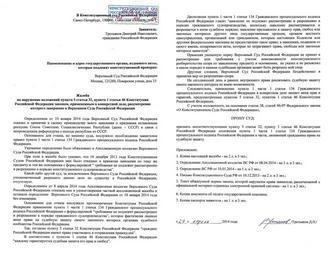 | Keywords: ЖАЛОБА В КОНСТИТУЦИОННЫЙ СУД РФ НА ОПРЕДЕЛЕНИЯ ВЕРХОВНОГО СУДА РФ ПО ДЕЛУ СССР.png ru Жалоба в Конституционный Суд РФ на Оп еделения Ве ховного Суда РФ на отказ п инять к своему п оизводству заявление О п изнании оспуска СССР неконституционным от жителя Тольятти Дмит ия Т етьякова 1981 года ождения en The complaint in the Constitutional Court of the Russian Federation on the Definition of the Supreme Court on refusal to accept the statement On recognition of the dissolution of the Soviet Union unconstitutional from a citizen of city Togliatti Dmitry Tretyakov 1981 year of birth 2014-04-29 own Dgeise Official documents 200px PD-RU-exempt cc-by-sa-4 0 Unconstitutional dissolution of the Soviet Union |