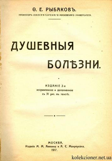 | Keywords: Рыбаков Ф.Е. Душевные болезни. 2-е изд. (1917). — Титульный лист.jpg http //kolekcioner net ua/ru_co1_bukinistika _medicina_html html Image page PD-RusEmpire Fedor Rybakov Title pages of books from Russia Books from Russia 1917 Books published in Moscow Books about medicine from Russia Title pages uploaded by Steven Pavlov from various sources | ||||